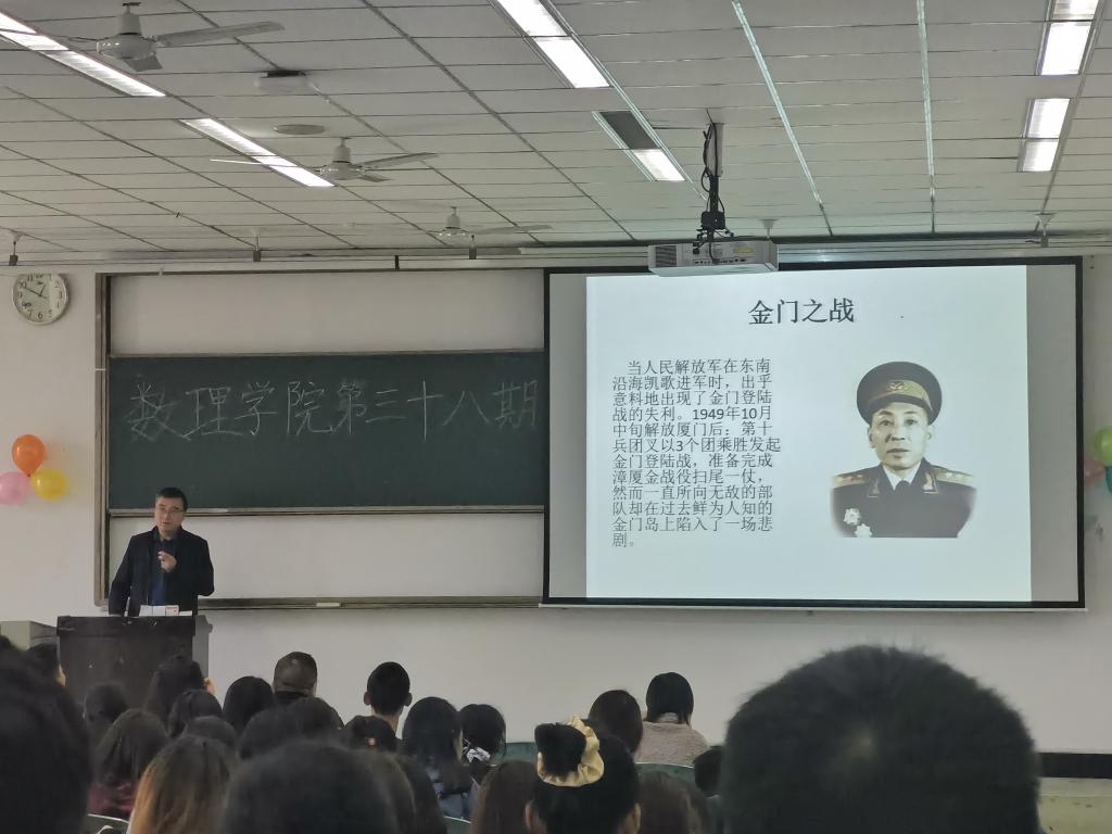 本网讯(文、图/廖宇麻雪琳)2021年4月15日中午,数理学院在行知楼301室召开党史学习教育大会。党总支书记余德刚主讲,学生科长陈盈舟、辅导员曹琳、全体学生党员、党员发展对象和入党积极分子共计270余人参加学习,教育大会由数理学院辅导员廖宇主持。