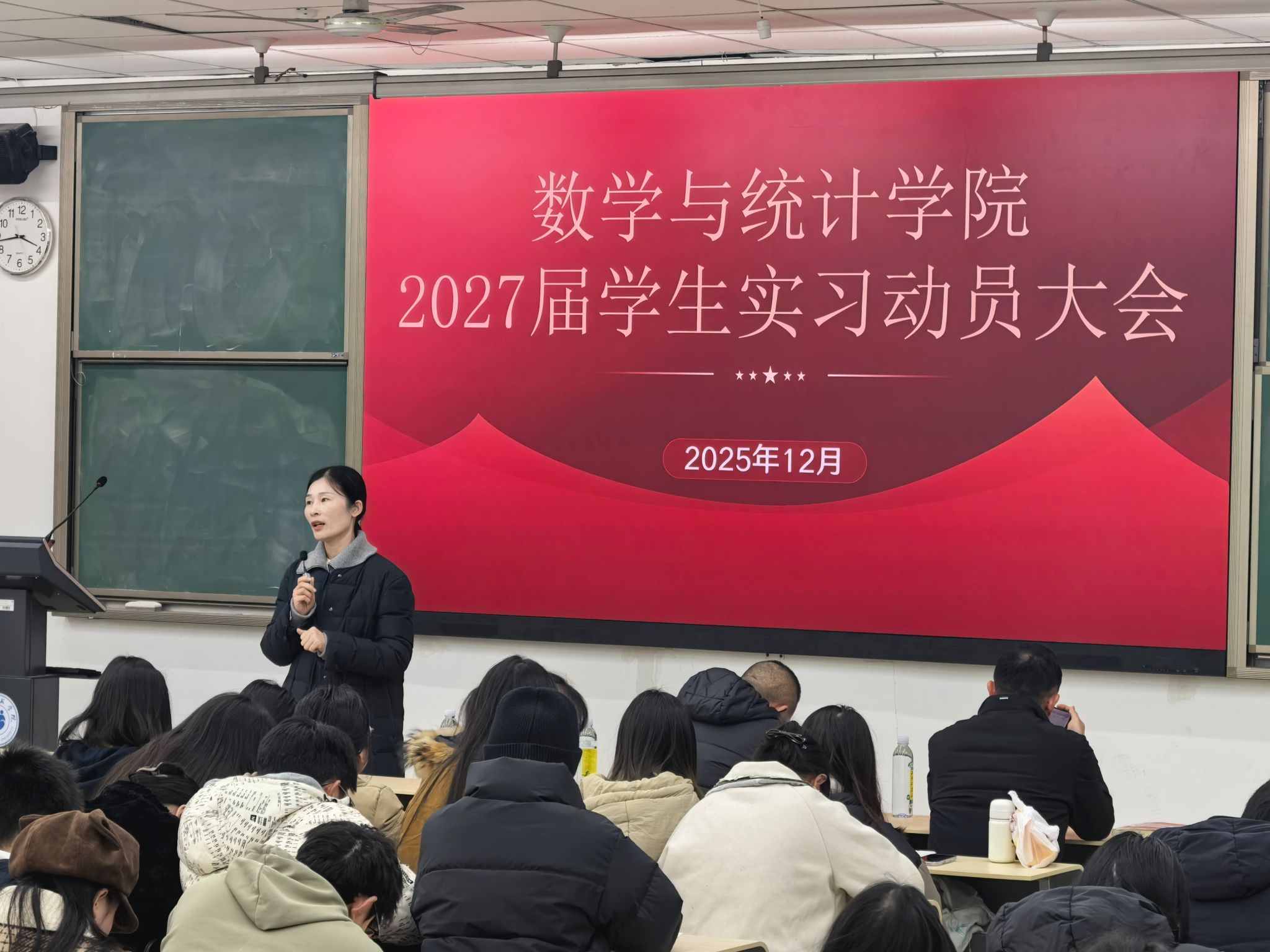 本网讯(文/胡云娇 图/黄彩城)为扎实推进实践教学高质量开展,引导学生明晰职业发展路径,夯实就业竞争力基础,12月31日,数学与统计学院于行知楼125教室召开2027届师范生实习动员大会。学院党委书记马力强、院长屈小兵、党委副书记夏红、副院长孙海、实习负责人杨建辉老师,各年级辅导员及全体大三学生齐聚一堂,共商实习规划,共话成长蓝图。