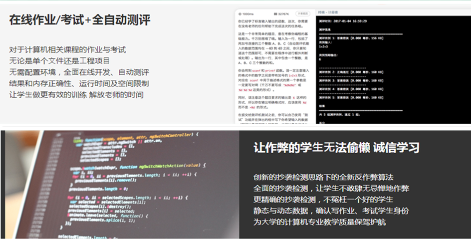 由计蒜客提供的教学平台基于AI技术,通过人工智能辅助教学,网上布置作业,考试自动化评测及反作弊 ,通过大数据分析,注重学生的学习和实践动手能力,帮助学生学得更好,提高专业的人才培养质量,为我院应用型人才培养提供实践教学条件。