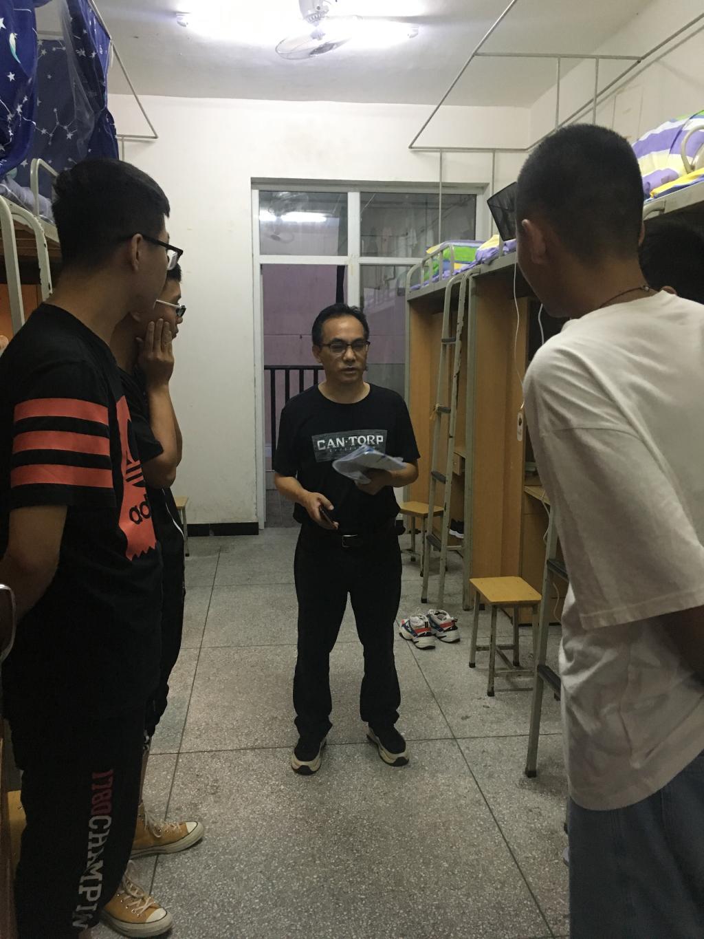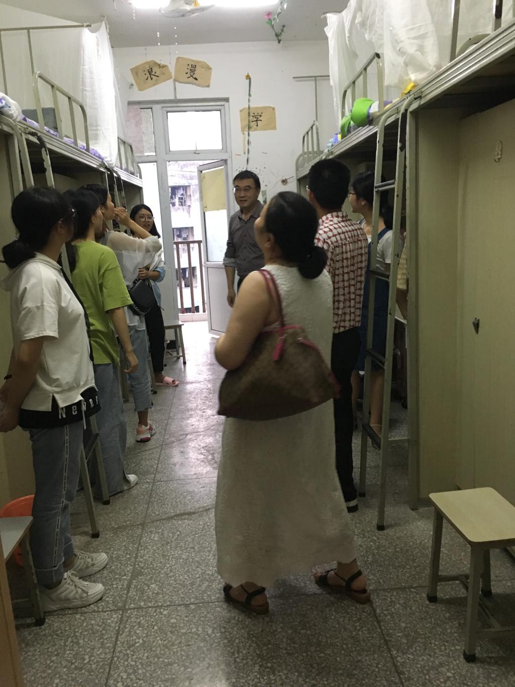2019年9月6日晚上19:00,数信学院书记余德刚,院长龙述君,副书记王志明,副院长屈小兵,18级辅导员江纳,19级辅导员曹琳,各班班主任以及各班副班主任走访慰问了新生寝室。
