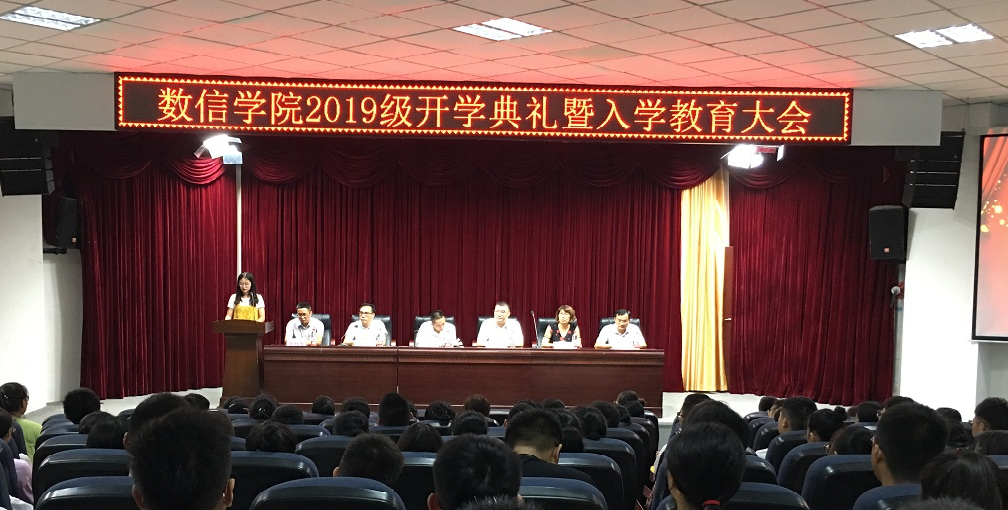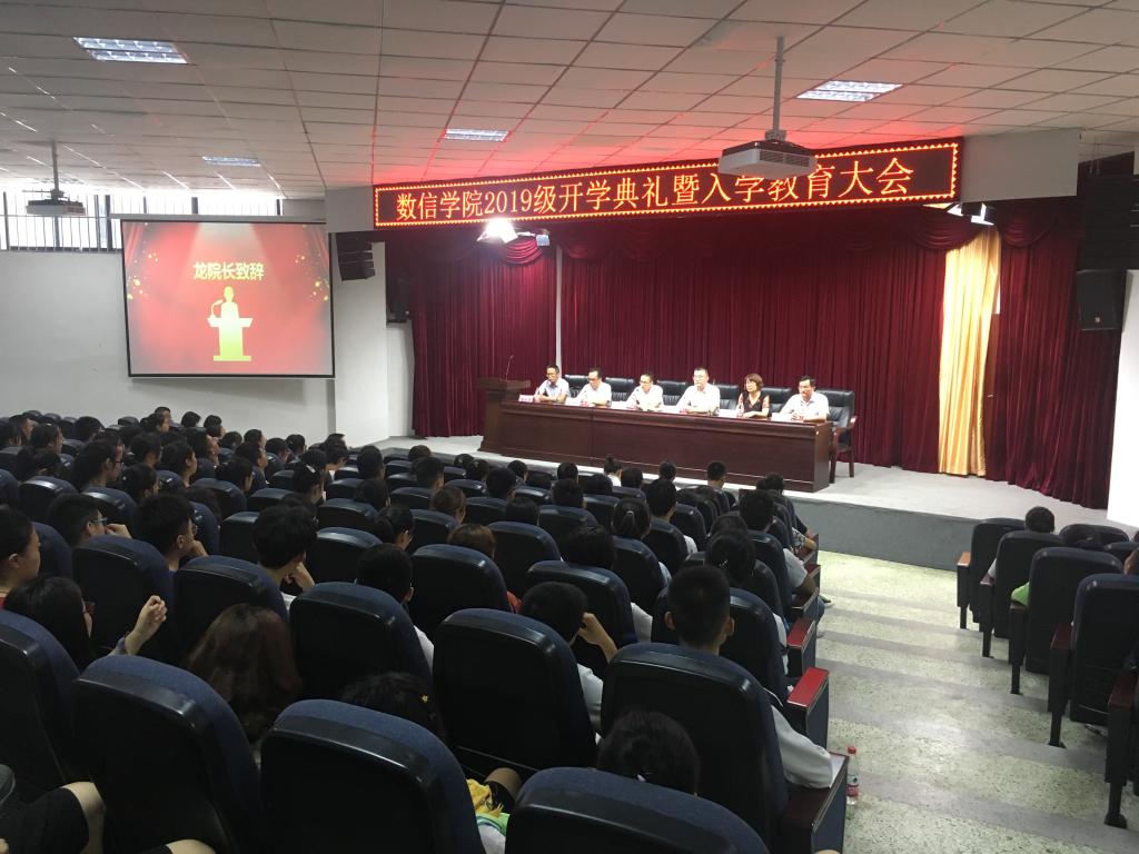 本网讯 (文、图/曹琳、江纳)2019年9月8日下午,数信学院在特教大楼A-102举行2019级新生开学典礼暨入学教育大会。学院党总支书记余德刚,院长龙述君,党总支副书记王志明,副院长李木华,副院长屈小兵,教师代表高仕龙教授,18、19级辅导员,各班班主任及副班主任,2019级全体新生参加此次大会。