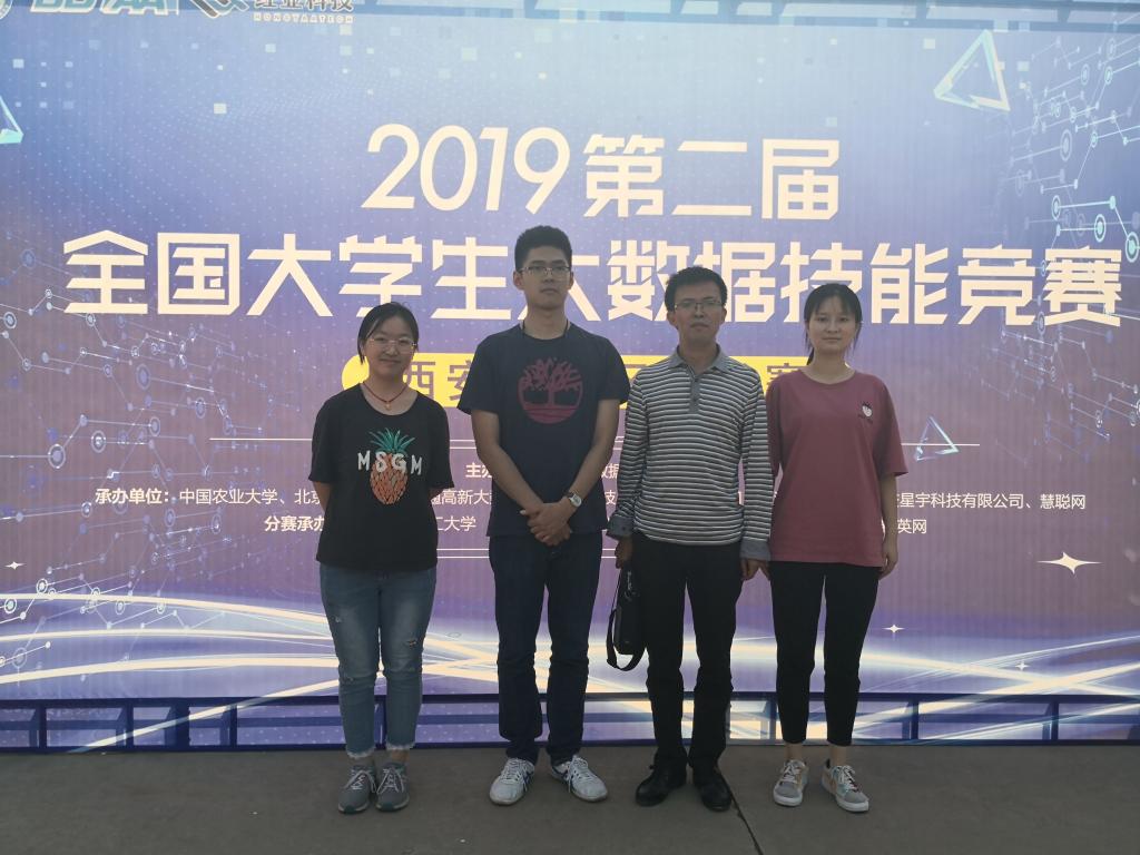 本网讯 (文、图/贾礼平) 9月28日,数信学院贾礼平教授带领2017级应用统计学专业学生李锦、魏琳、陆智翔,参加了在西安理工大学(曲江校区)举行的“2019年第二届全国大学生大数据技能竞赛”西安赛区选拔赛,并荣获团队三等奖。