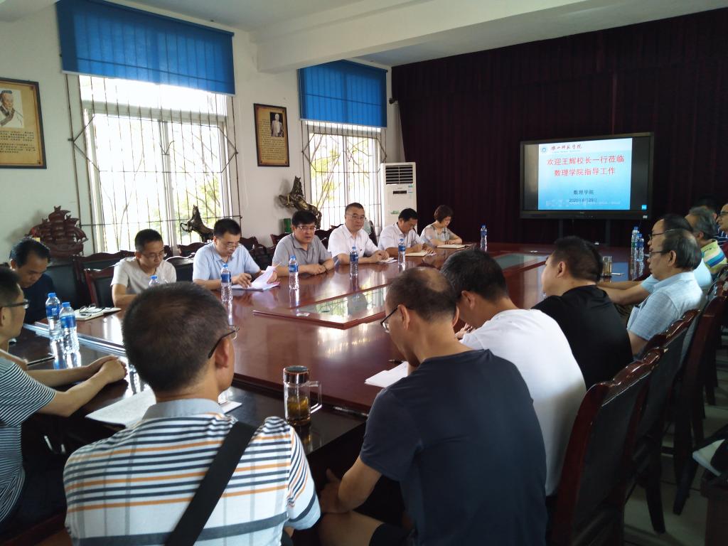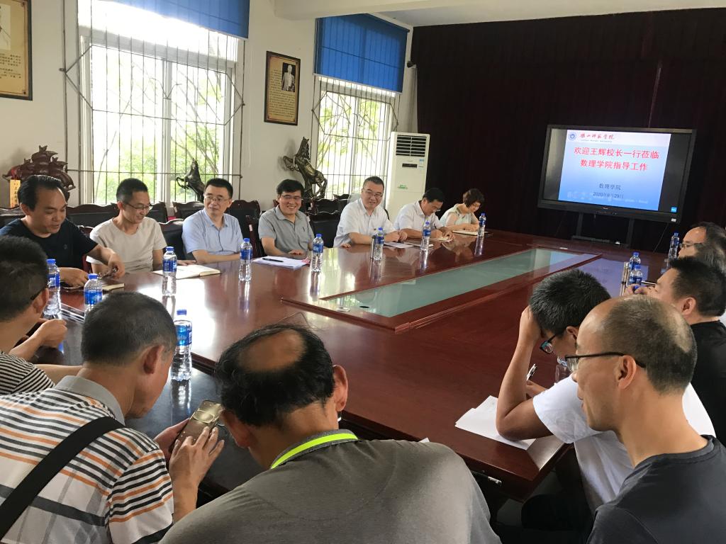 本网讯 (文、图/陈红君) 6月29日,学校党委副书记、校长王辉带领党委组织部部长李方裕到数理学院指导工作。会议在数理学院会议室举行。原数信学院党总支委员、领导班子成员、各党支部书记、教研室主任、专业负责人、科级干部、教代会执委、民主党派代表、无党派代表、全体行政人员,原物电学院物理学专业教师参加了会议。