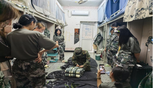 在宿舍内,助教团队以规范动作为示范,先向新生展示军被叠放的标准流程,随后切换至打背包教学环节,通过连贯的操作演示,让新生直观了解内务整理的要点。