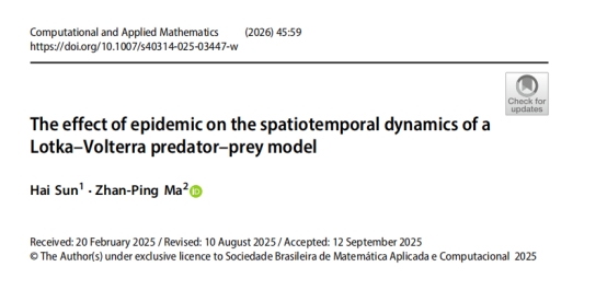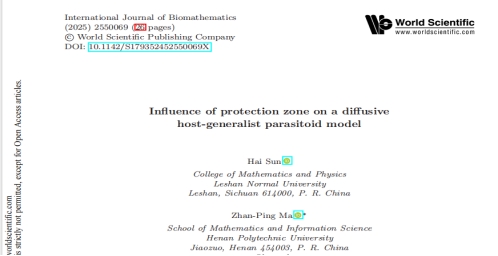 本网讯(文、图/樊华娜)近日,我院孙海教授与河南理工大学数学与信息科学学院马战平博士合作的两篇论文分别刊登在《International Journal of Biomathematics》(中科院二区),《Computational and Applied Mathematics》(中科院三区),我校为第一单位。两篇论文均聚焦非线性偏微分方程中的反应扩散模型展开研究。