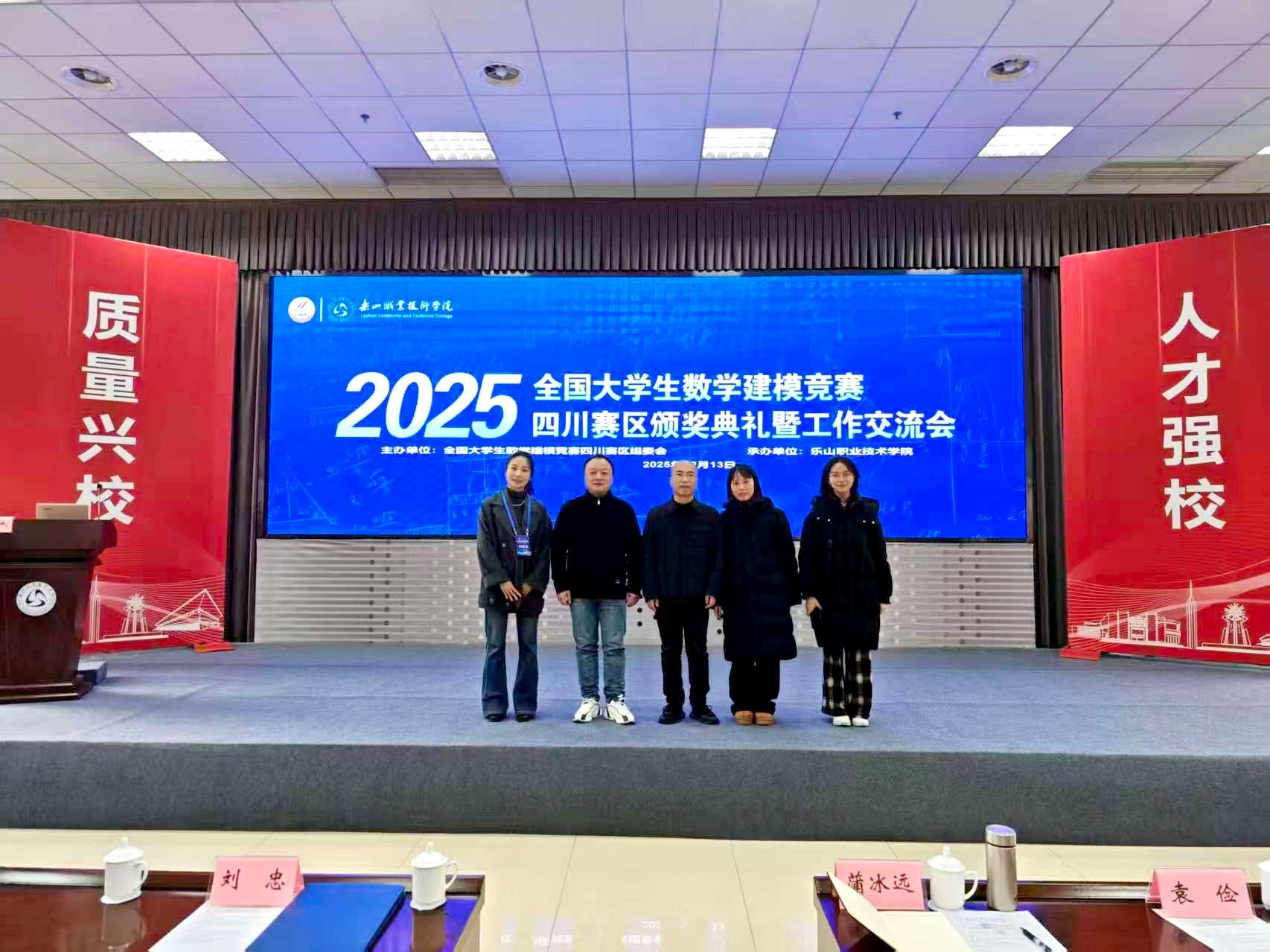 本网讯(文、图/刘高峰)2025年12月13日,全国大学生数学建模竞赛四川赛区颁奖暨工作交流会在四川乐山举行,会议由全国大学生数学建模竞赛四川赛区组织委员会主办,乐山职业技术学院承办,数统学院于恩锋副院长、数学建模教师团队成员张立、李阳、刘高峰、侯利元等参加了本次会议。